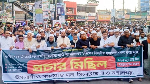 সিলেট সরকারী আলিয়া মাদ্রাসা মাঠে শনিবারের বিভাগীয় সমাবেশ সফলের লক্ষ্যে বৃহস্পতিবার (৪ ডিসেম্বর) সিলেট জেলা ও মহানগর ইসলামী ও সমমনা ৮ দলের উদ্যোগে অনুষ্ঠিত প্রচার মিছিল পূর্ব সমাবেশে বক্তারা উপরোক্ত কথাগুলো বলেন। মিছিলটি বৃহস্পতিবার বাদ আসর বন্দরবাজারস্থ সিটি পয়েন্ট থেকে শুরু হয়ে নগরীর গুরুত্বপূর্ণ পয়েন্ট প্রদক্ষিণ শেষে চৌহাট্টা পয়েন্টে গিয়ে সমাপ্ত হয়।